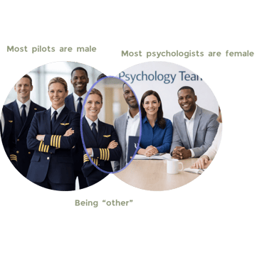The Venn diagram here captures a simple but telling truth beautifully illustrated by my two professions: most pilots are male, most psychologists are female — and those who sit outside those norms often end up doing extra, invisible work just to belong. Extra explaining. Extra vigilance. Extra self-monitoring. Not because they lack ability, but because difference is still treated as deviation.